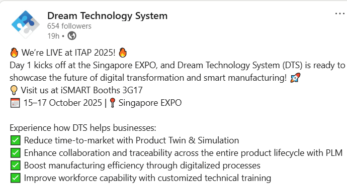 Dream Technology System (DTS) 由一群來自各行各業、相信通過提高效率、生產力和增值來幫助客戶實現卓越成就的年輕企業家創立的組織。在新加坡和馬來西亞運營,擁有4個辦公室以支持我們的客戶,已與西門子數字工業軟件(SISW)、ZWSOFT、Shining 3D 和 Zortrax 建立了戰略合作關系,并在該地區獲得了西門子 SMART 合作伙伴認證。DTS是一站式咨詢、服務和產品生命周期管理(PLM)解決方案提供商,幫助您解決業務痛點。
